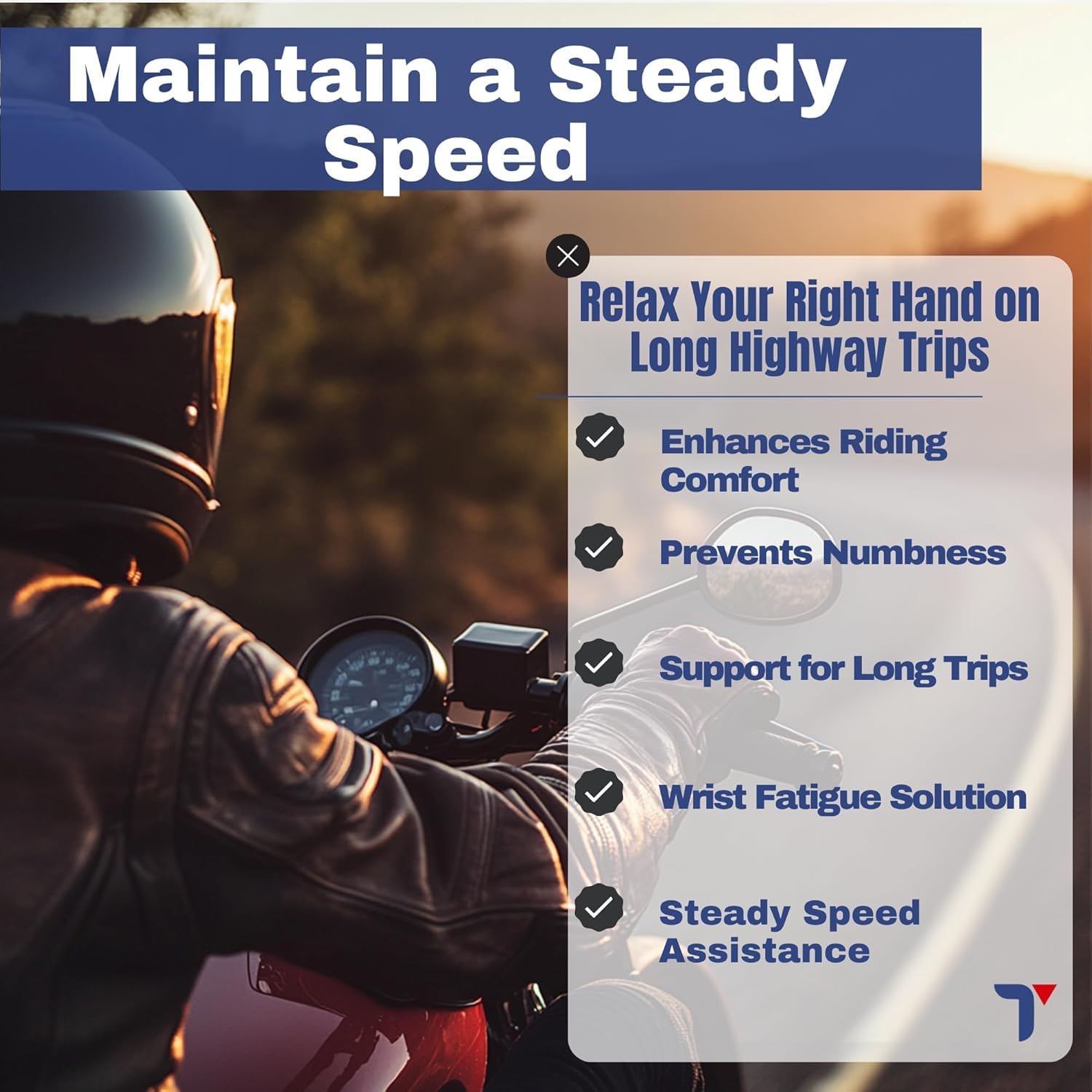 - CONSISTENT CRUISING SPEED: This motorcycle must-have maintains a steady speed, allowing riders to relax their right hand on long highway trips. It also includes a rubber ring for secure attachment to handlebars, preventing slippage when locked.