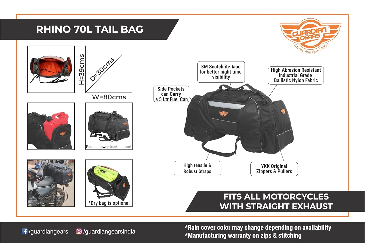 GUB GUARDIANGEARS Rhino 70L Tail Polyester Bag with Rain Cover for All Motorcycles from 100CC to 1000CC