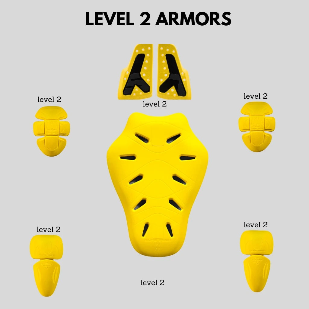- Elbow: Safe-Tech | CE Level 2 | T+T- Approved, Shoulder: Safe-Tech | CE Level 2 | T+T- Approved, Back: Safe-Tech | CE Level 2 | T+T- Approved, External Metal Sliders at shoulders for added protection, Chest: Safe-Tech | CE Level 2 | T+T- Approved.